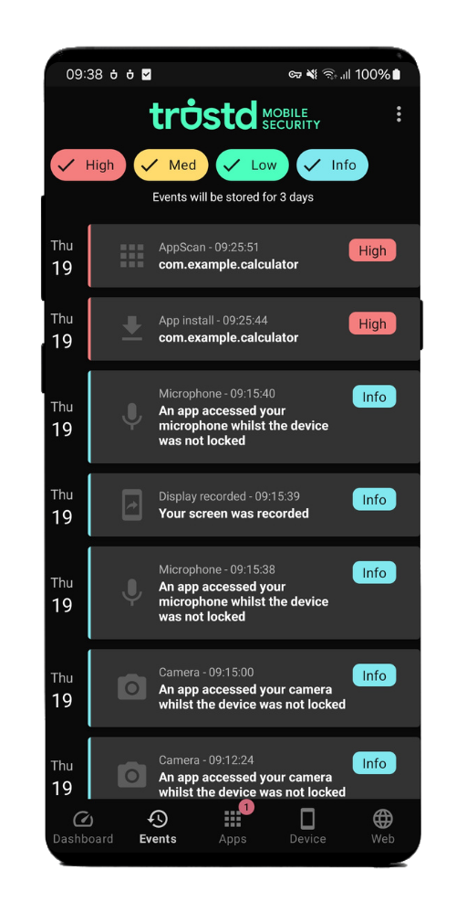 Find stalkerware and spyware apps that might be abusing the permissions you’ve granted them, such as access to camera, microphone, or location. These apps are often hidden, but Trustd Mobile Security uncovers them and helps you to remove from the device.